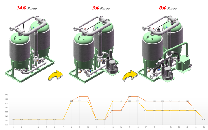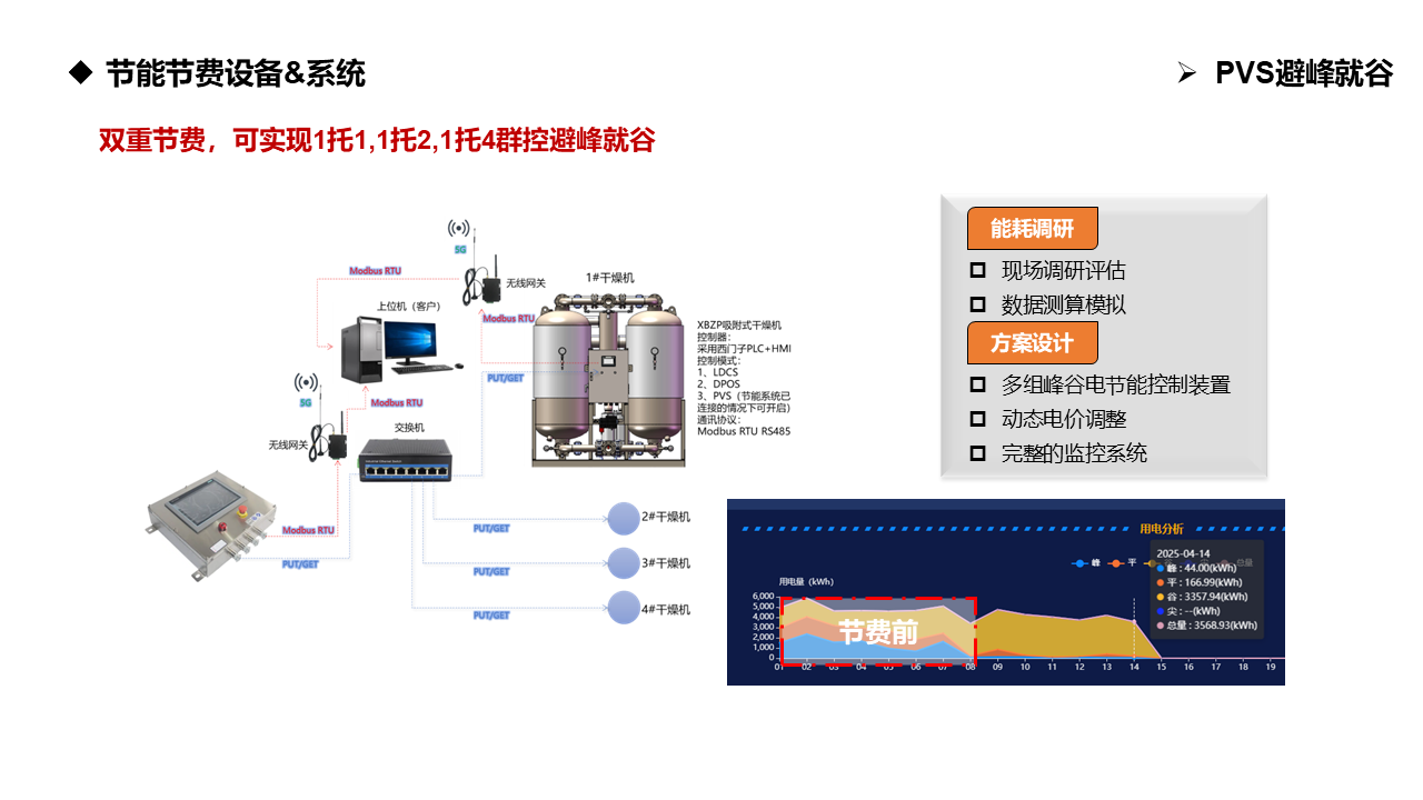 利用先进的节能控制系统结合高效运维吸附改性材料,可以提供出厂自带PVS避峰就谷的节能节费设备;同时针对现场原有设备也可评估并针对软硬件改造,实现1拖4的群控避峰就谷;