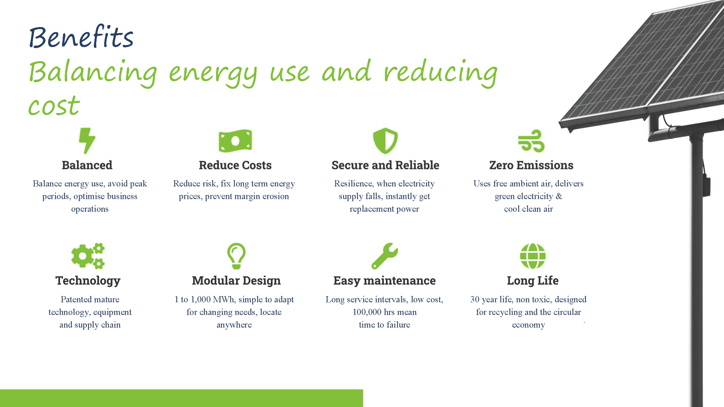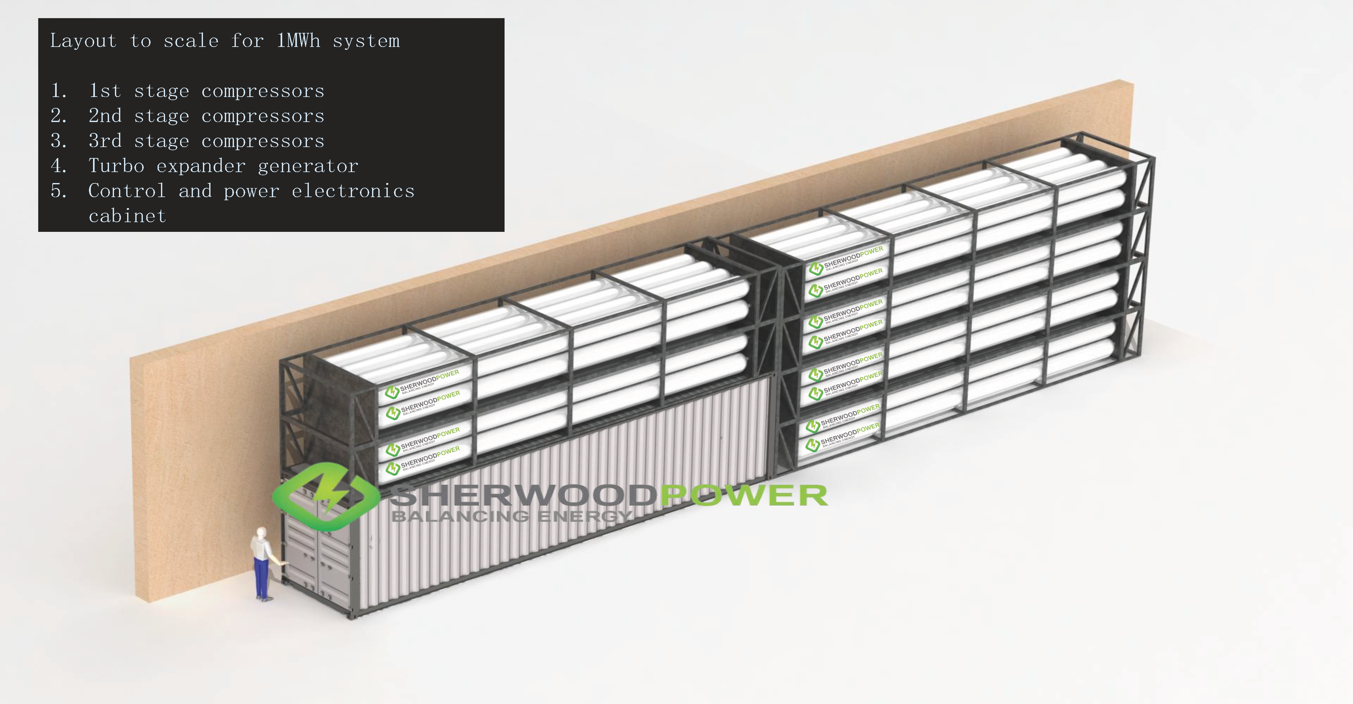 分布式压缩空气储能解决用户侧1~1000MWH的避峰就谷调峰节费和一些特殊应用场景阶段性高峰用电补给的场合;模块化的拼装结构,将绿电/谷电通过压缩空气和热量回收储存能量,在需求时间段做集中发电输出能源。在此过程中还有部分冷、热能量及压缩空气可以作为选项输出,可以与园区/厂区内的多样化需求深度结合,充分利用。